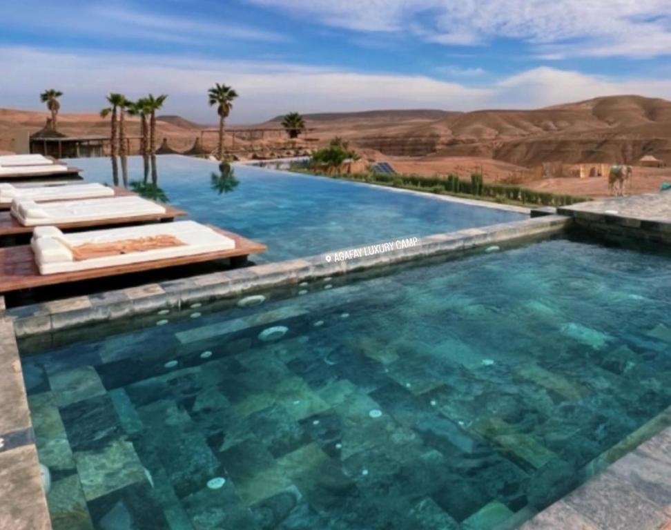 Situated within 36 km of Menara Gardens and 38 km of Djemaa El Fna, Agafay Luxury camp provides rooms with air conditioning and a private bathroom in Marrakech. This property offers access to a terrace, darts, free private parking and free WiFi. The luxury tent features an infinity pool with a pool bar, as well as spa facilities and a 24-hour front desk. At the luxury tent, units come with a desk. There is a private bathroom with shower in every unit, along with bathrobes, a hair dryer and free toiletries. At the luxury tent, units include bed linen and towels. The luxury tent specialises in a continental and vegetarian breakfast and breakfast in the room is also available. Guests are welcome to eat in the on-site family-friendly restaurant, which is open for dinner, lunch, brunch and cocktails. A variety of wellness packages are available for guests to get rejuvenated in-house. For guests with children, Agafay Luxury camp offers kids pool. Guests can also warm themselves near outdoor fireplace after a day of cycling. Marrakesh Train Station is 38 km from the accommodation, while Bahia Palace is 38 km away. Marrakech-Menara Airport is 33 km from the property, and the property offers a paid airport shuttle service.