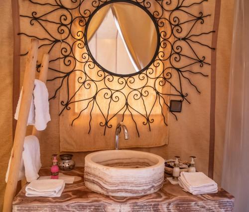 Providing a garden, Les Roches Desert Camp provides accommodations in Merzouga. There's a sun terrace and guests can access free Wifi and free private parking. There's a private bathroom with shower and bathrobes in each unit, along with slippers. At the luxury tent, every unit has a seating area. Guests can eat at the on-site traditional restaurant, which is open for dinner, lunch, brunch, and high tea. Yoga is available at the property. Guests can also warm up near the outdoor fireplace after a day of cycling. The nearest airport is Moulay Ali Cherif Airport, 76 miles from the luxury tent.