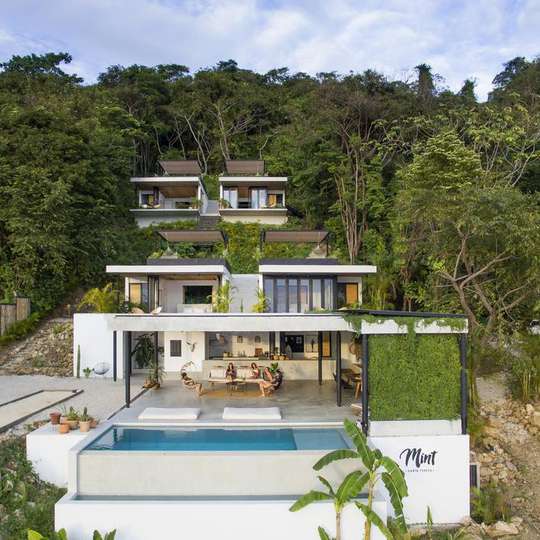 Mint Santa Teresa is a boutique hotel in the center of Santa Teresa, walking distance from restaurants, bars and the beautiful beach of Playa Carmen. The hotel has 4 rooms, all with ocean view, king size bed, and private roof top terrace, and a communal area with an infinity pool overlooking the Pacific Ocean. Every morning there is a breakfast buffet (included in the room price) served in the common area and around sunset everyone gathers in the bar, sharing stories over drinks.