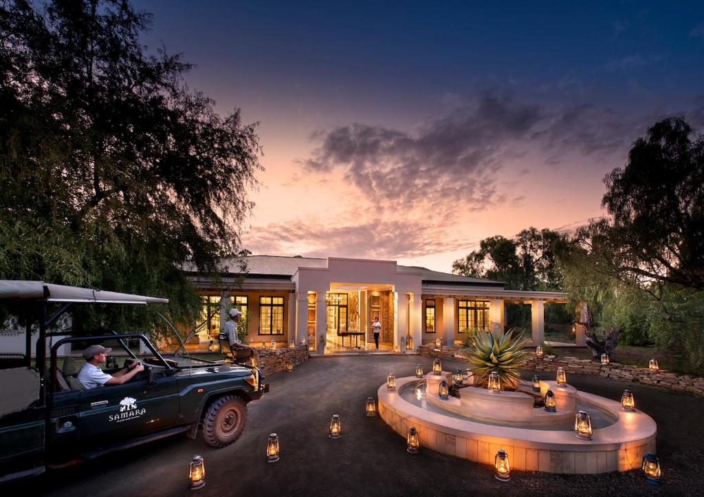 The malaria-free Samara Karoo Reserve is located near Graaff-Reinet in the Great Karoo. The reserve offers luxury accommodations and game drives. Accommodations is offered in two intimate lodges. The rustic-chic Karoo Lodge is a renovated farmhouse and boast a veranda while the elegant Manor House has an infinity pool. All units have air-conditioning, a patio, tea-and-coffee making facilities. All meals and selected drinks are included and served in the dining area or outdoors. Guests can join two daily game activities, such as game drives or bush walks with an experienced game ranger. Port Elizabeth is a 2.5 hour drive from the accommodations and there is a private air strip located 20 minutes' drive from the lodges.