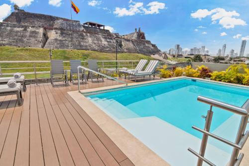 Bastión Luxury Hotel is a property located in the center of Cartagena de Indias. The hotel's rooms are equipped with a wardrobe, flat-screen TV, private bathroom, free Wi-Fi, bedding, and towels. Some rooms also feature a safe and a patio. Additionally, you can access various recreational areas such as the garden, terrace, outdoor pool, and the El Gobernador restaurant, where you can enjoy a buffet-style breakfast. The hotel offers room service, a 24-hour reception, and tour arrangements. Nearby points of interest include Marbella Beach, Bocagrande Beach, and the Palace of the Inquisition. The nearest airport is Rafael Núñez International Airport, located 4.3 mi from the property. Shuttle service to and from the airport is available for an additional fee.