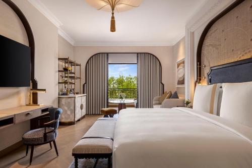 The Meydan Hotel Dubai Features 2 restaurants, one lobby lounge, and a pool side bar and very spacious room, with balcony facing to the racecourse.This 5-star hotel has free Wi-Fi. The accommodations offers a 24-hour front desk, room service and currency exchange for guests. The hotel will provide guests with air-conditioned rooms offering a desk, a kettle, a safety deposit box, a flat-screen TV and a private bathroom with a bidet. Every room is equipped with a coffee machine, while some rooms also offer a balcony and others also have city views. The Meydan Hotel Dubai is home to one of the world's richest horse races – the annual Dubai World Cup. Golf course and tennis academy are adjacent to the hotel. Buffet breakfast is available every morning at the accommodations. The Dubai Fountain is 3.1 mi from The Meydan Hotel Dubai, while Dubai Mall is 3.1 mi from the property. The nearest airport is Dubai International Airport, 7.5 mi from the hotel.